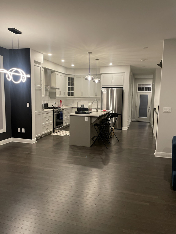 Fully equipped kitchen with fridge, stove, microwave, and dishwasher